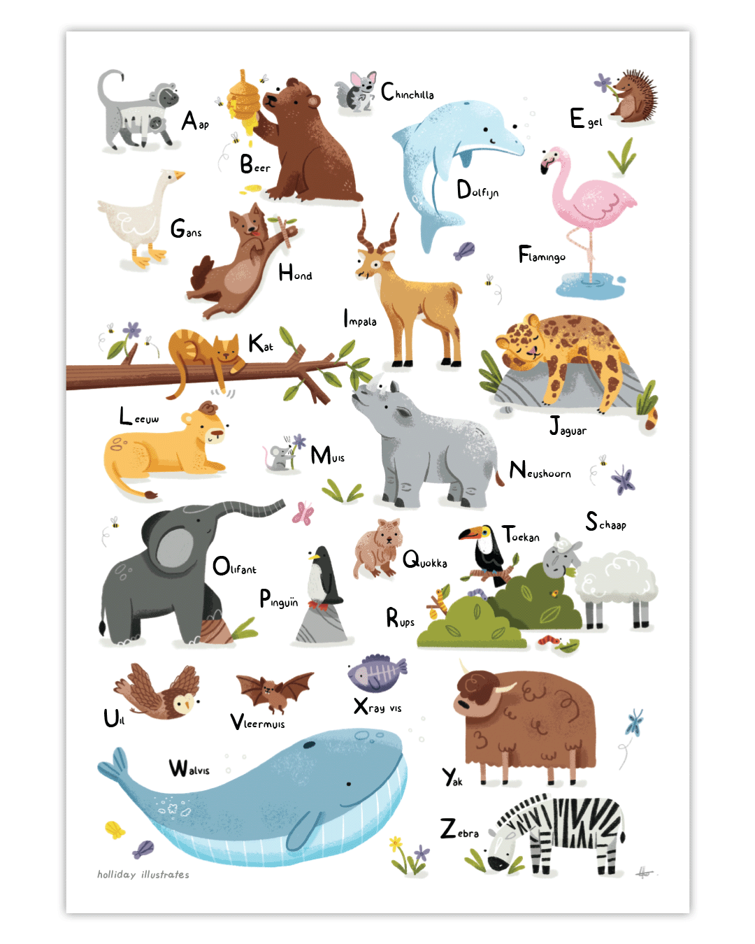 This illustrated Animal Alphabet print is available in both English and Dutch.