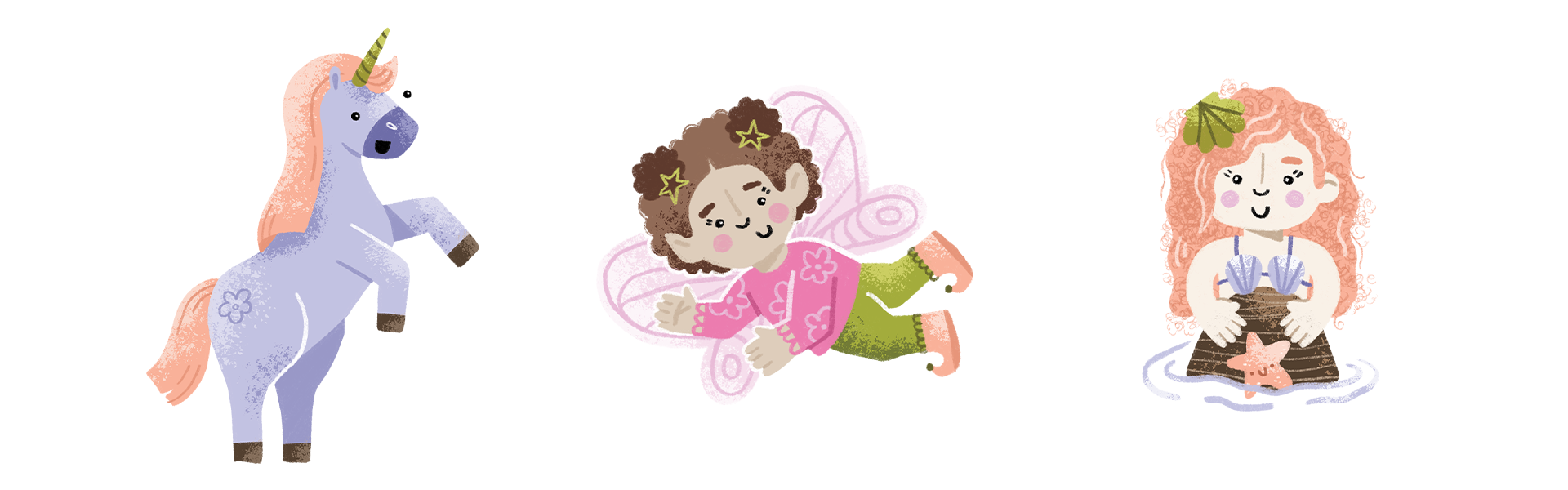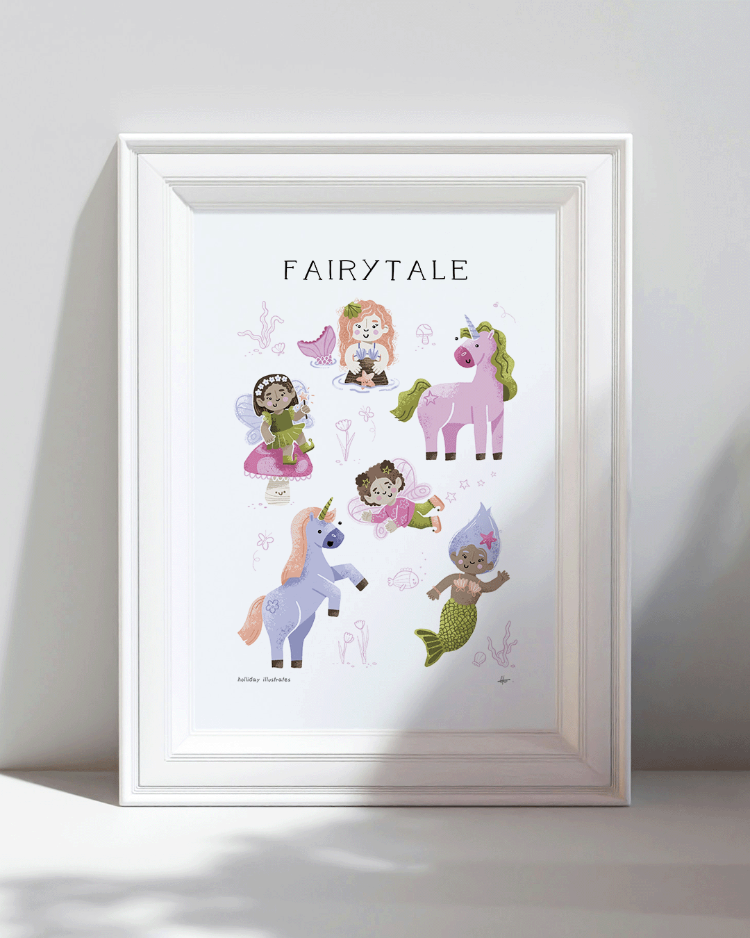 "Fairytale" is a new children's print featuring some adorably illustrated unicorns, fairies, and mermaids. This whimsical children's print would look perfect on any wall!