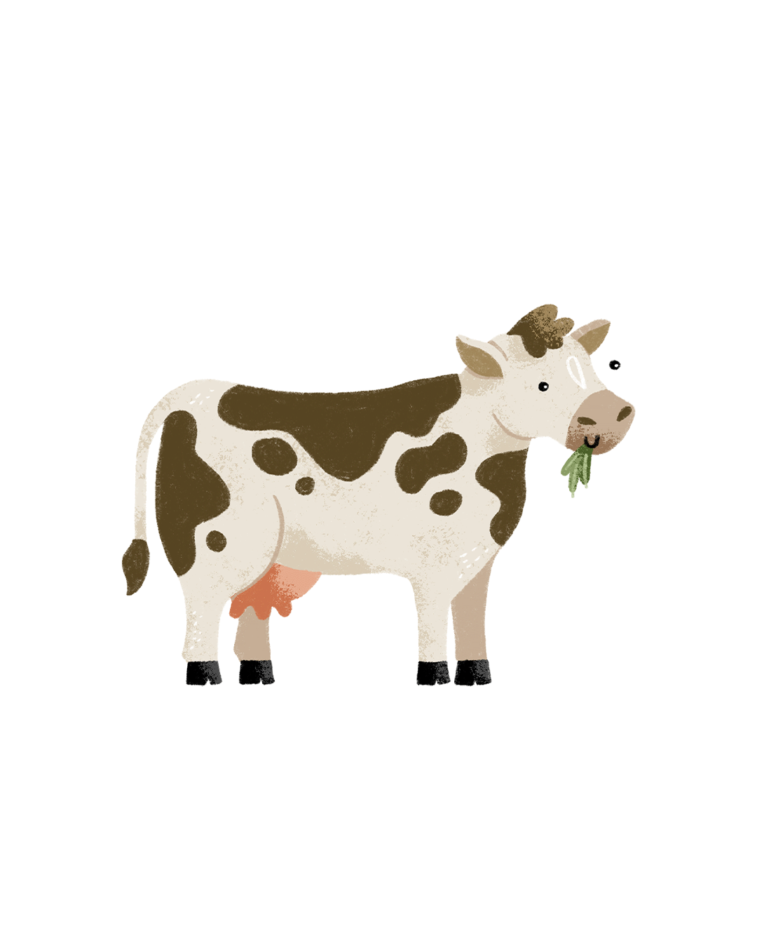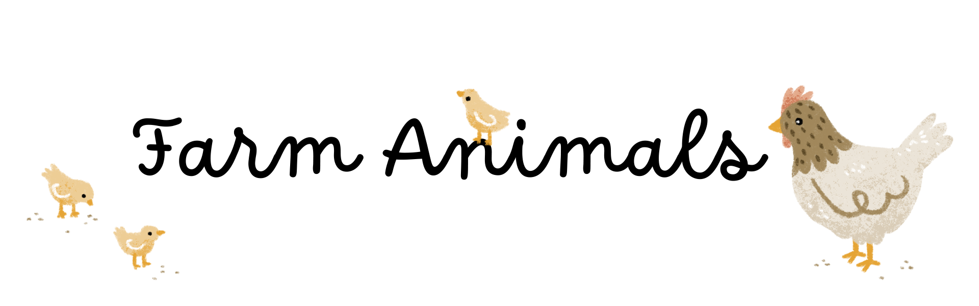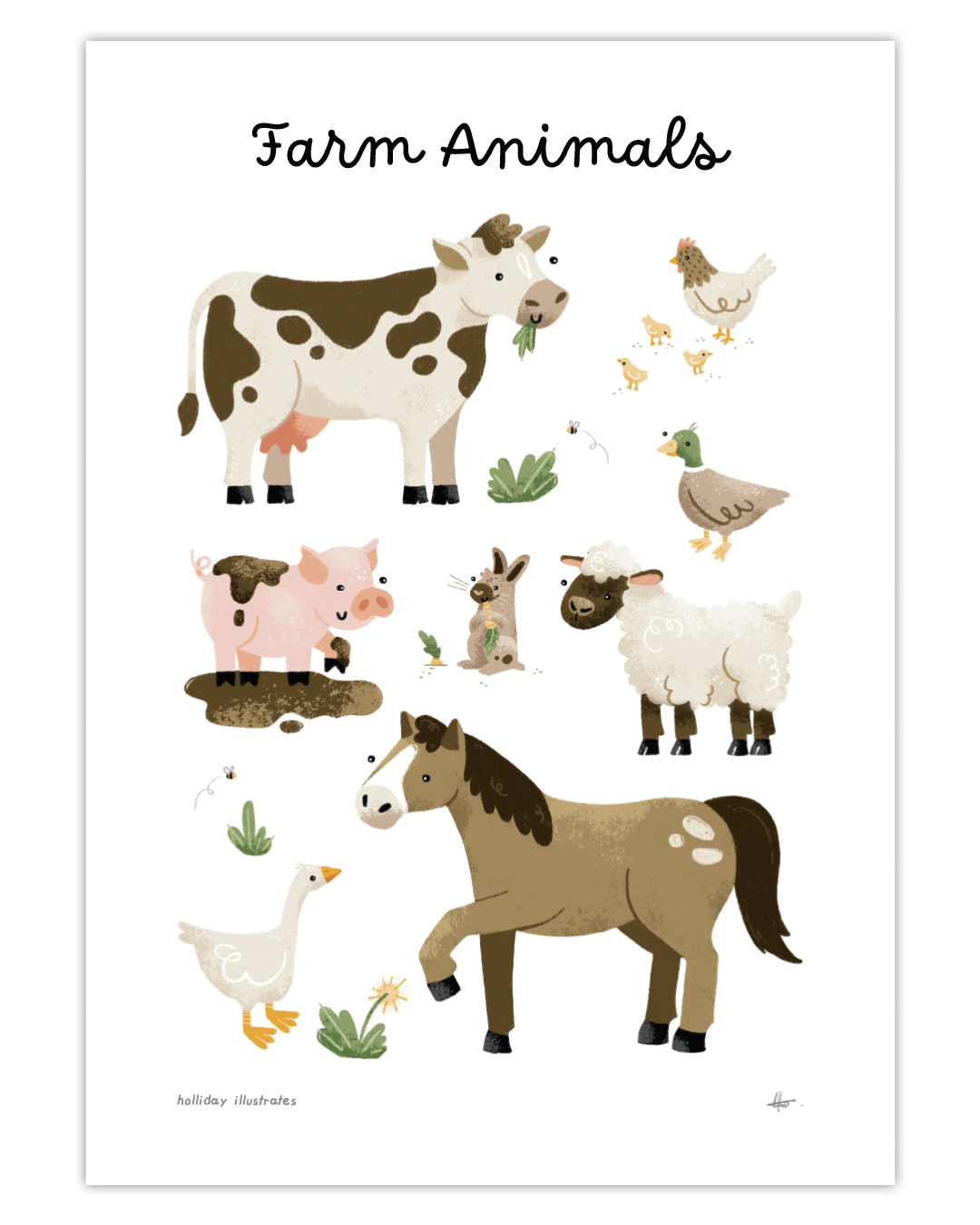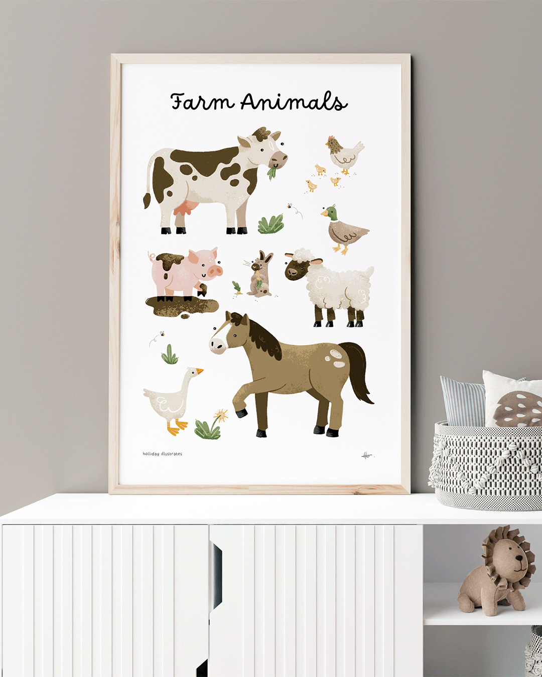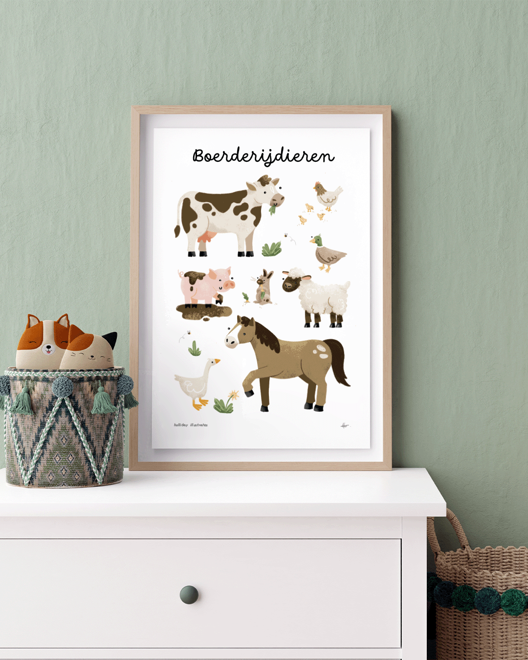 "Farm Animals" is an illustrated children's print consisting of some cute chickens, a cow, a muddy pig and a trotting horse. It is available in English and Dutch.