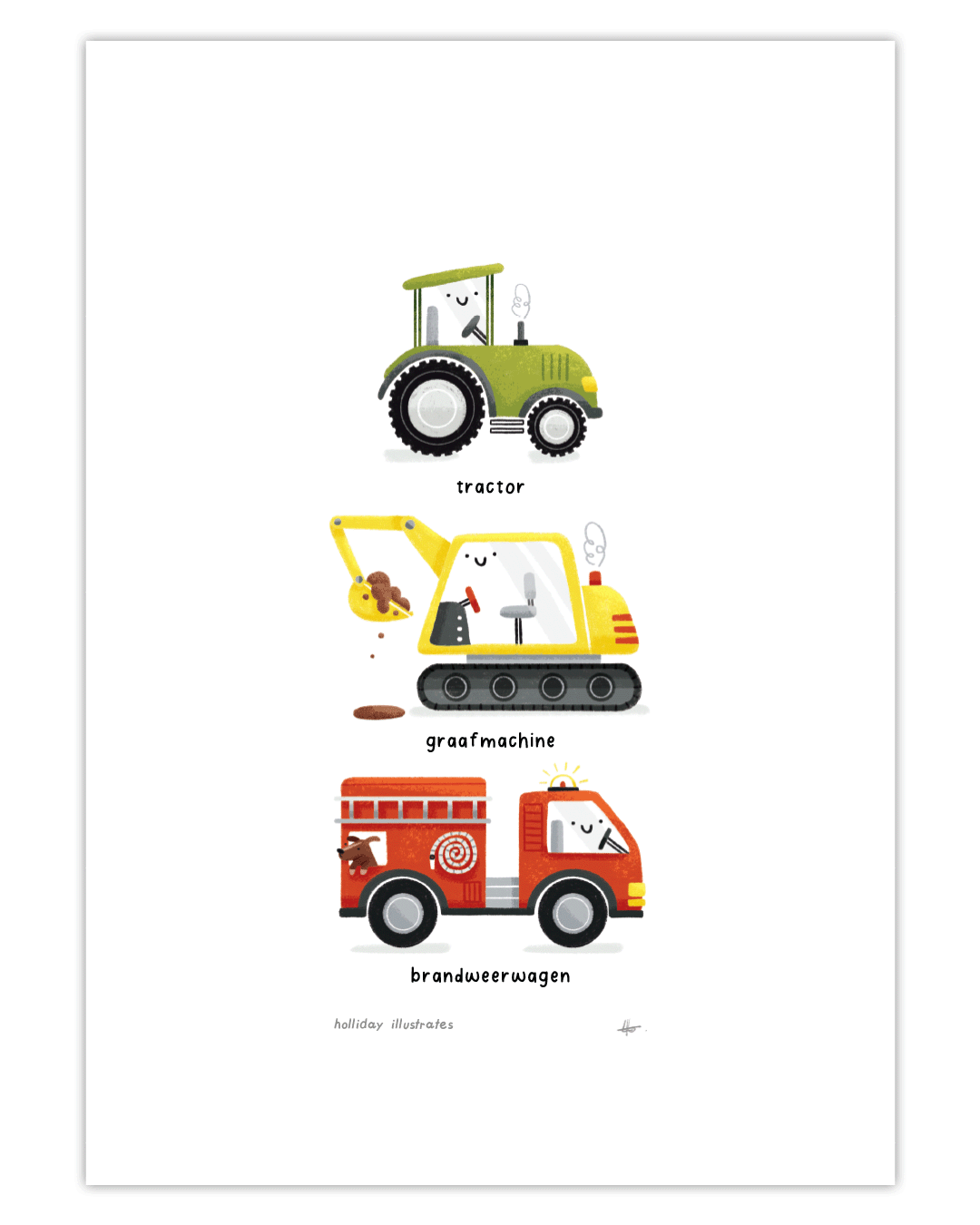 What began as a personal project illustrating a tractor, fire truck, and excavator has evolved into a printed series, now available for purchase! The three little trucks are available as individual prints or as a set.