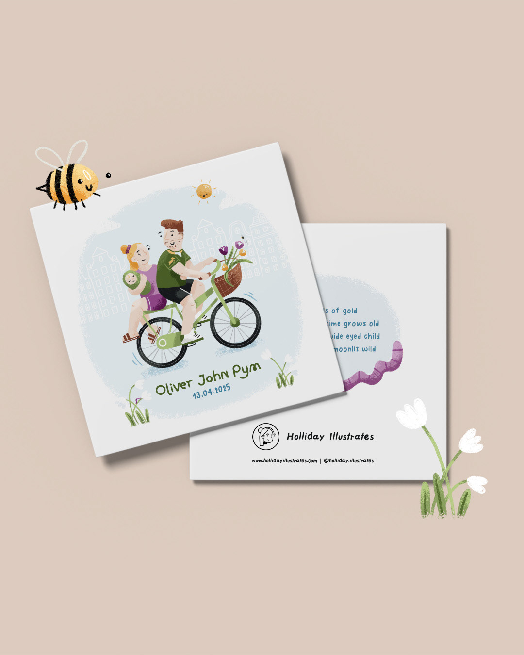 Our son was born during Spring, so I decided to illustrate the three of us on a bicycle, cycling through the city in full bloom.