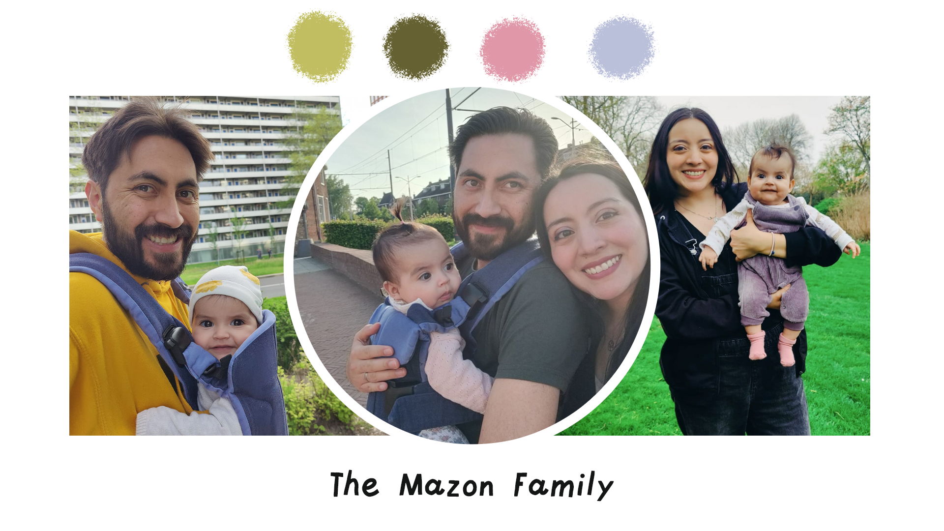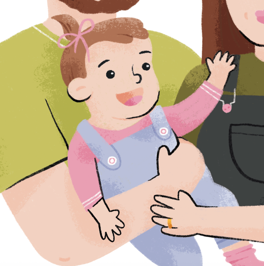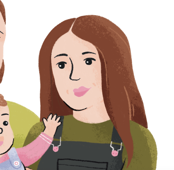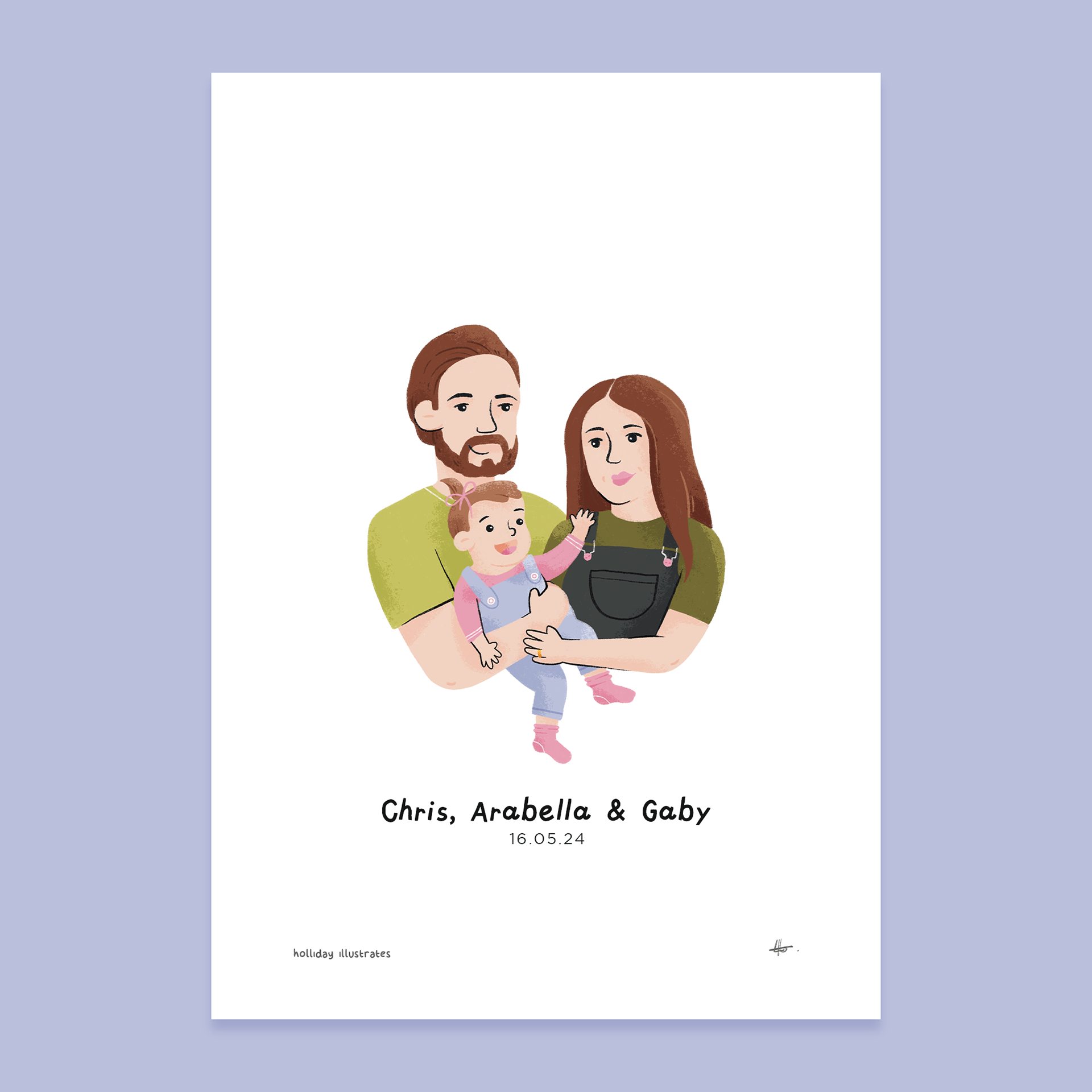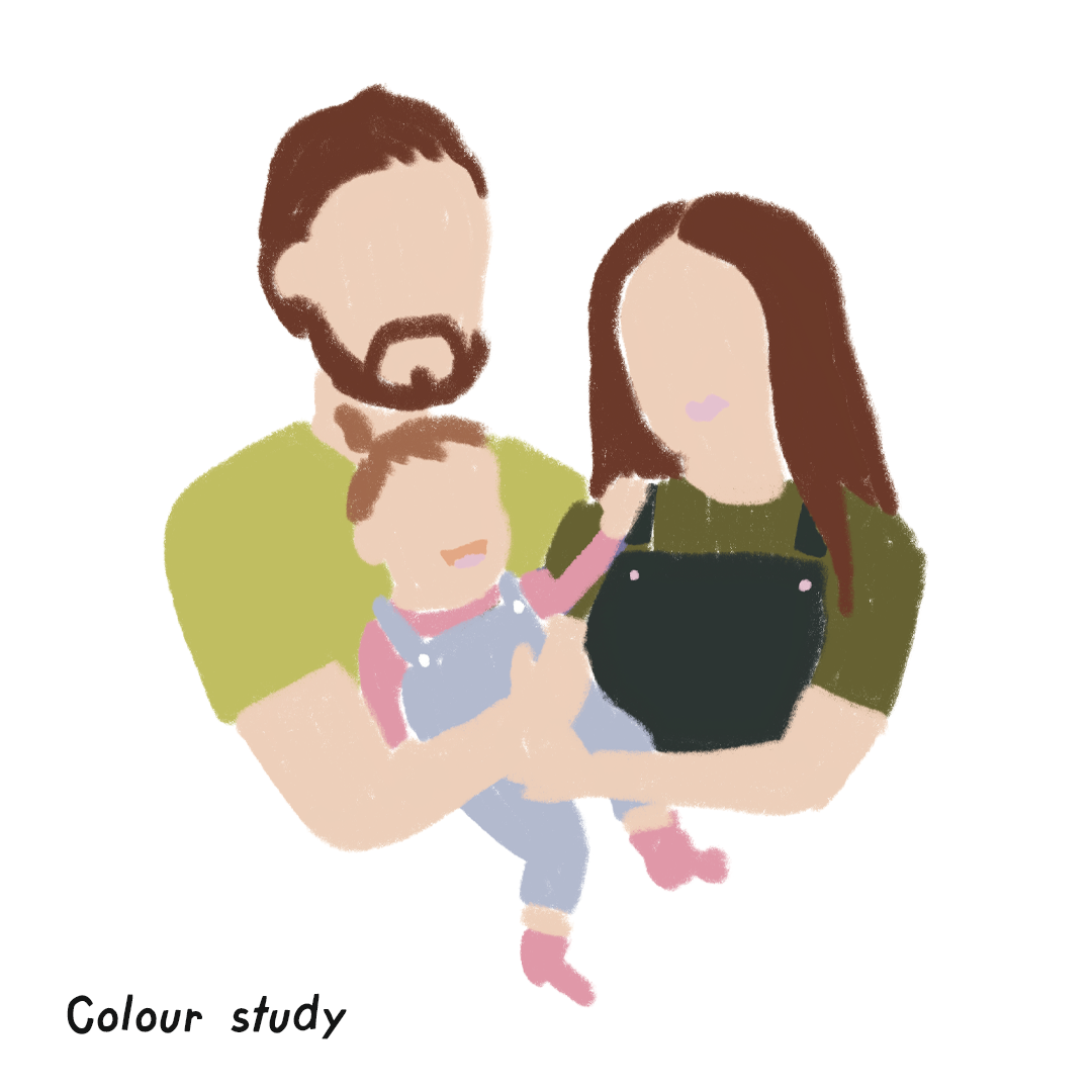 I love this colour palette as I felt the greens and purples complimented each other nicely, and draws more attention to baby Arabella in the centre of her parents. This portrait was illustrated in Procreate and then added textures in Photoshop.